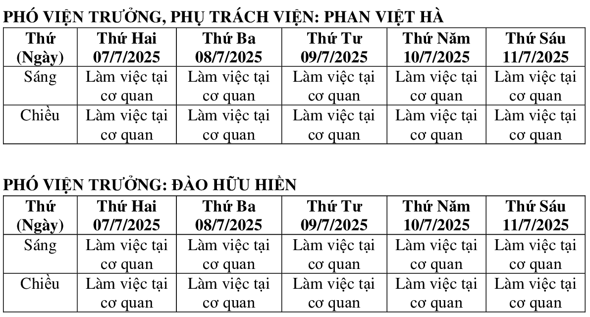 LỊCH LÀM VIỆC DỰ KIẾN CỦA BAN LÃNH ĐẠO VIỆN TUẦN 07/7 – 11/7/2025