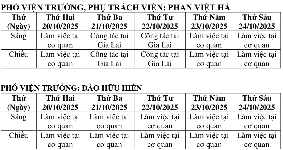 LỊCH LÀM VIỆC DỰ KIẾN CỦA BAN LÃNH ĐẠO VIỆN TUẦN 20/10 – 24/10/2025