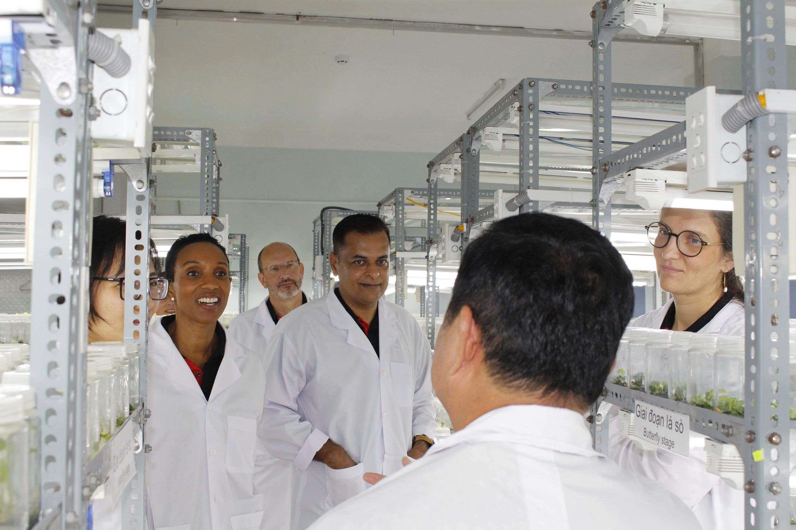 Sau khi làm việc tại Phòng họp, Đoàn Lãnh đạo Cấp cao của NESTLE đã tham quan Phòng nuôi cấy mô tế bào thực vật, vườn huấn luyện cây, vườn ươm và mô hình khảo nghiệm các giống nhập nội từ NESTLE./.