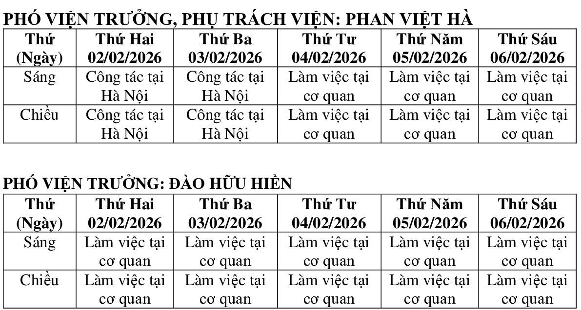 LỊCH LÀM VIỆC DỰ KIẾN CỦA BAN LÃNH ĐẠO VIỆN TUẦN 02/2 – 06/2/2026