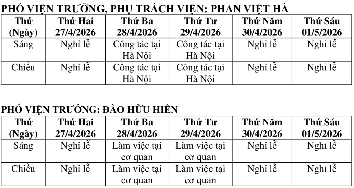 LỊCH LÀM VIỆC DỰ KIẾN CỦA BAN LÃNH ĐẠO VIỆN TUẦN 27/4 – 01/5/2026